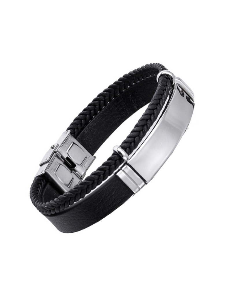 PARURE EN ACIER PENDENTIF RECTANGLE AVEC STRASS ET BRACELET EN CUIR AVEC PLAQUETTE EN ACIER