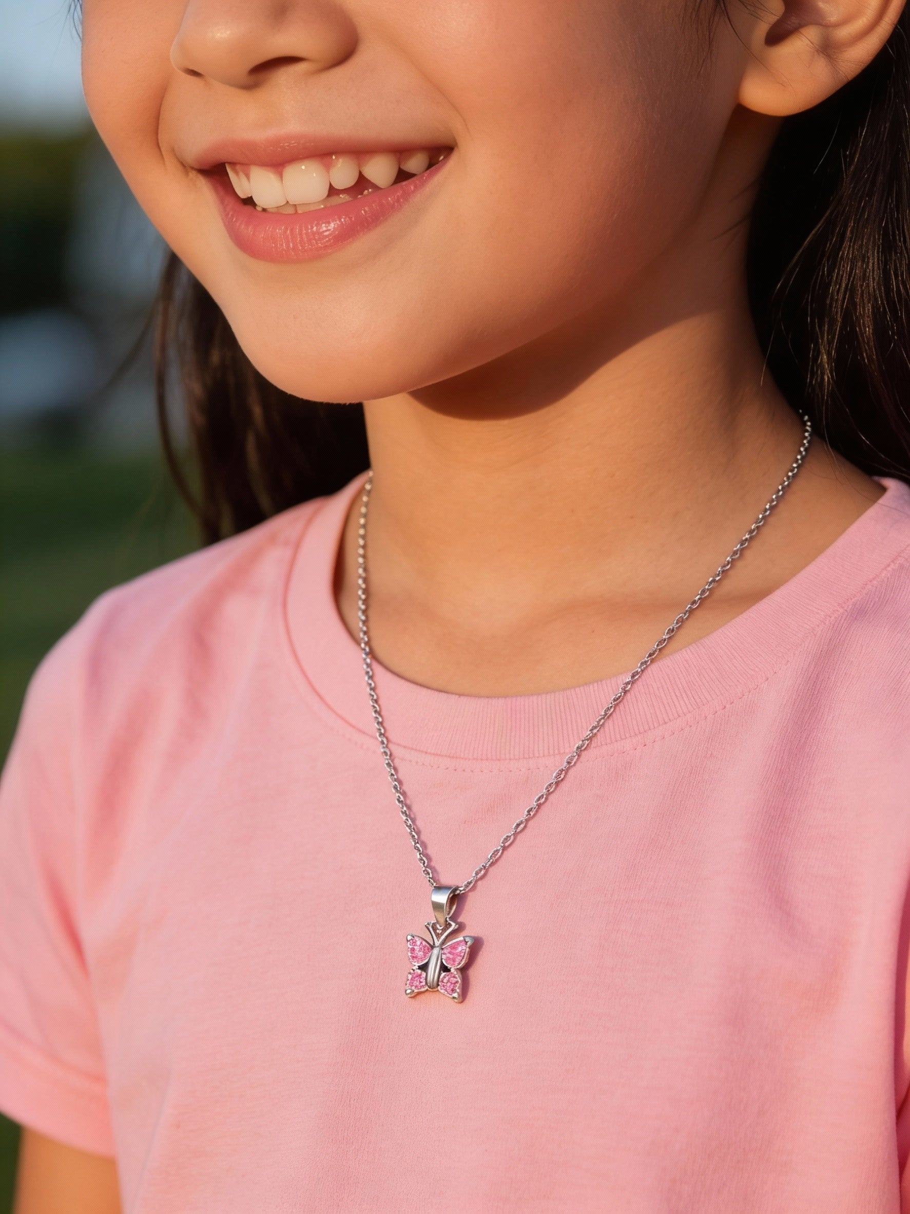 ZILVEREN KETTING MET VLINDERHANGER EN ROZE STENEN