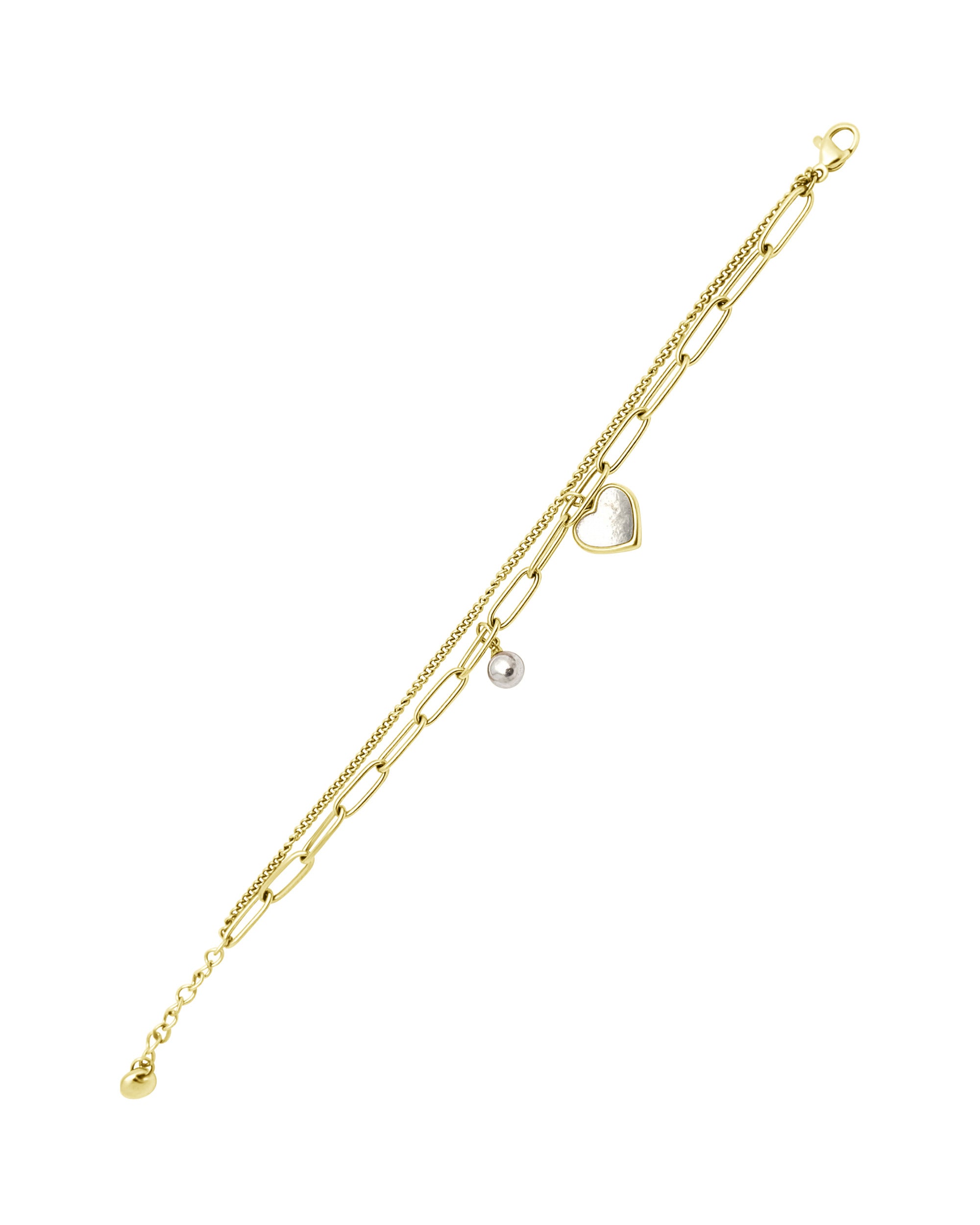 BRACELET EN ACIER DORE DOUBLE MAILLE COEUR NACRE ET PERLE