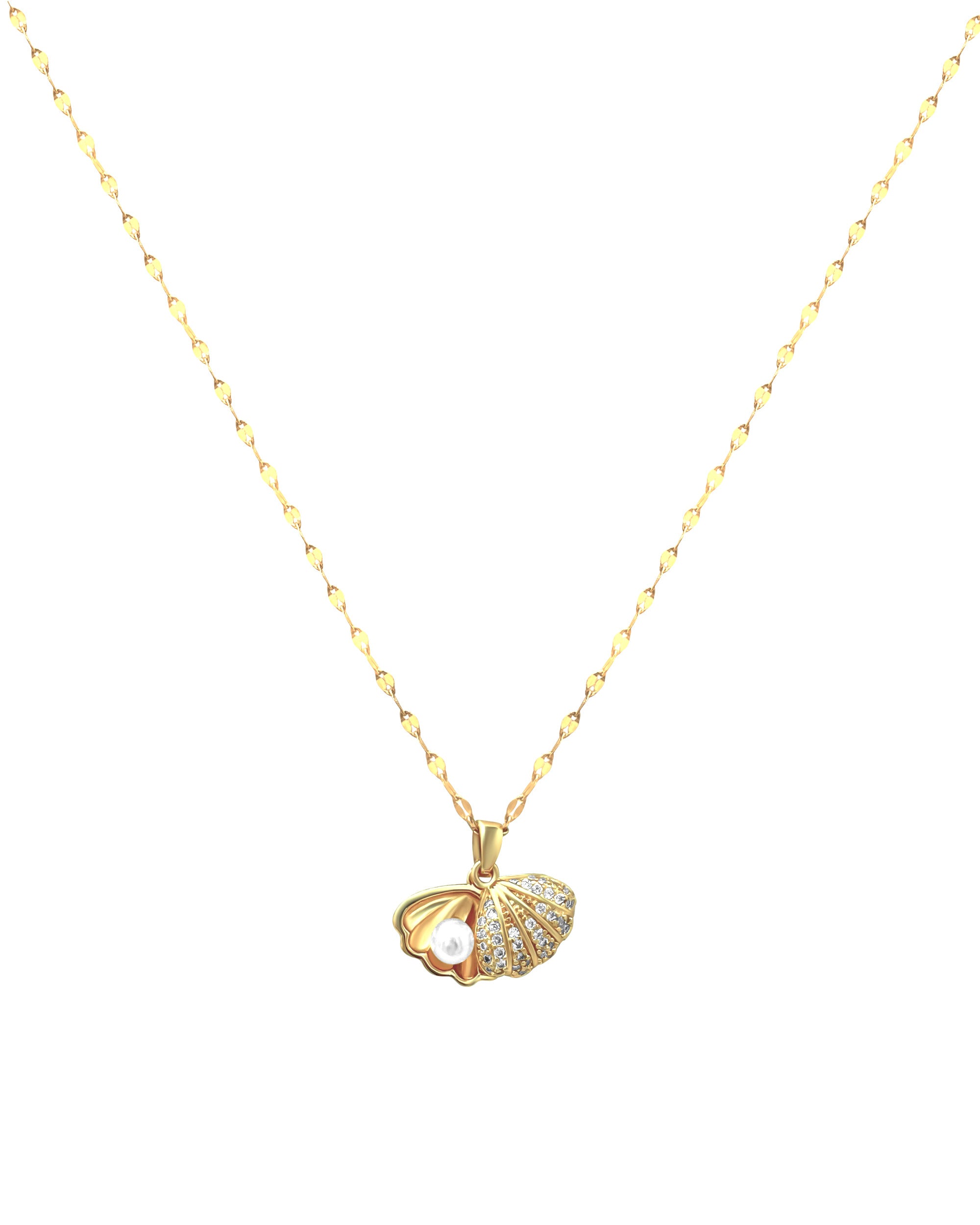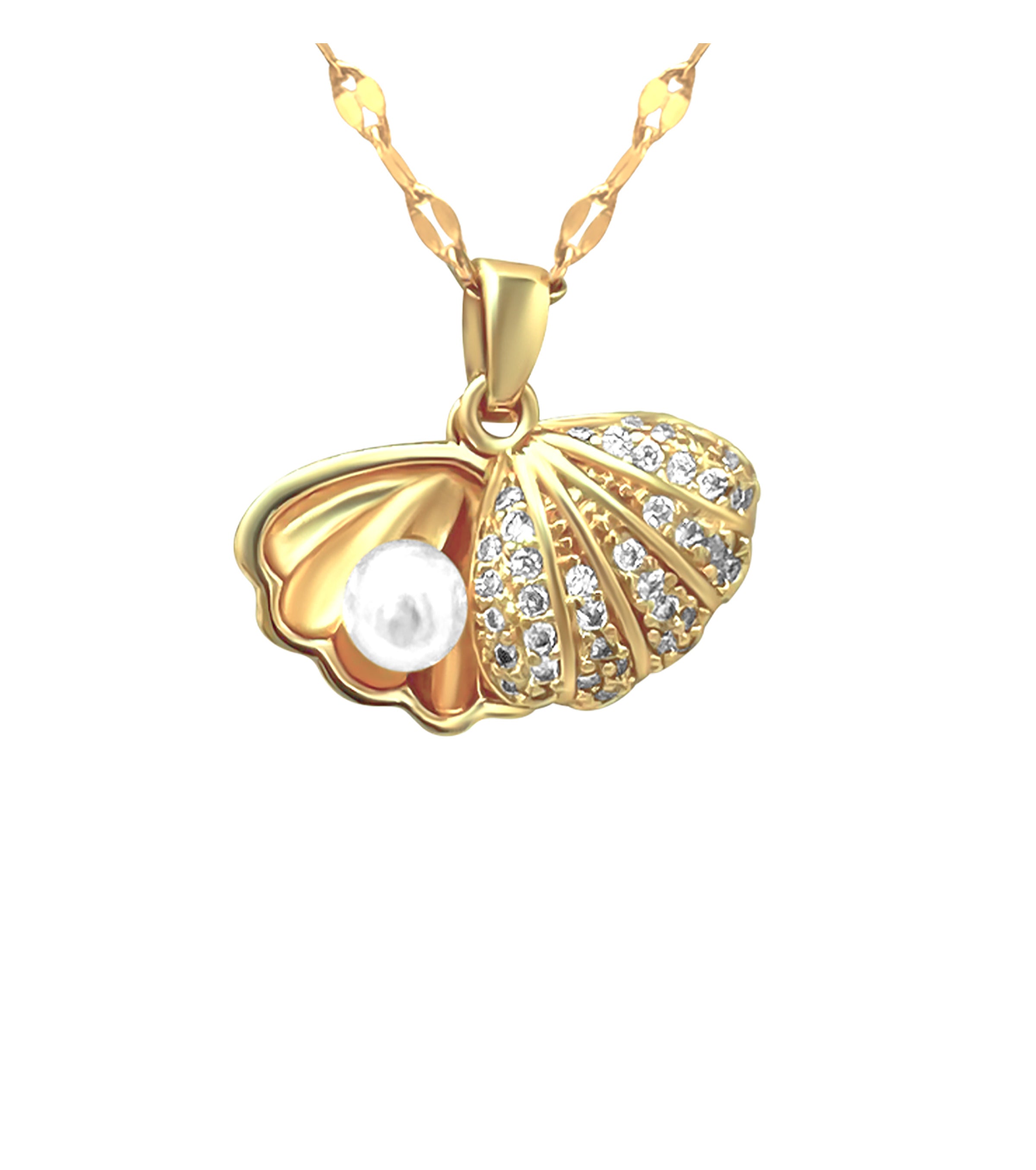 COLLIER EN ACIER DORE AVEC PENDENTIF COQUILLAGE OUVERT ET PERLE