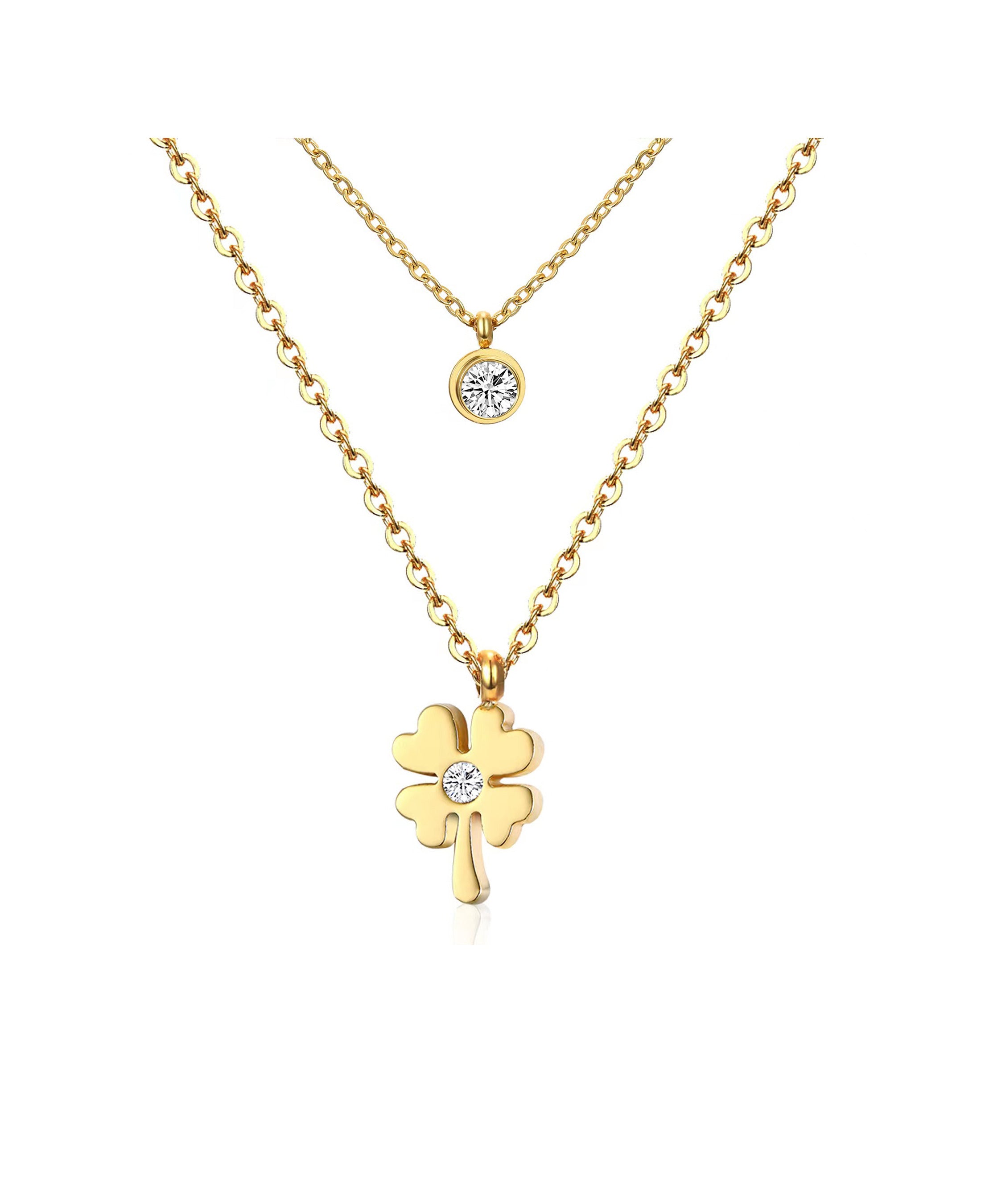 COLLIER EN ACIER DORE DOUBLE AVEC TREFLE ET SOLITAIRE