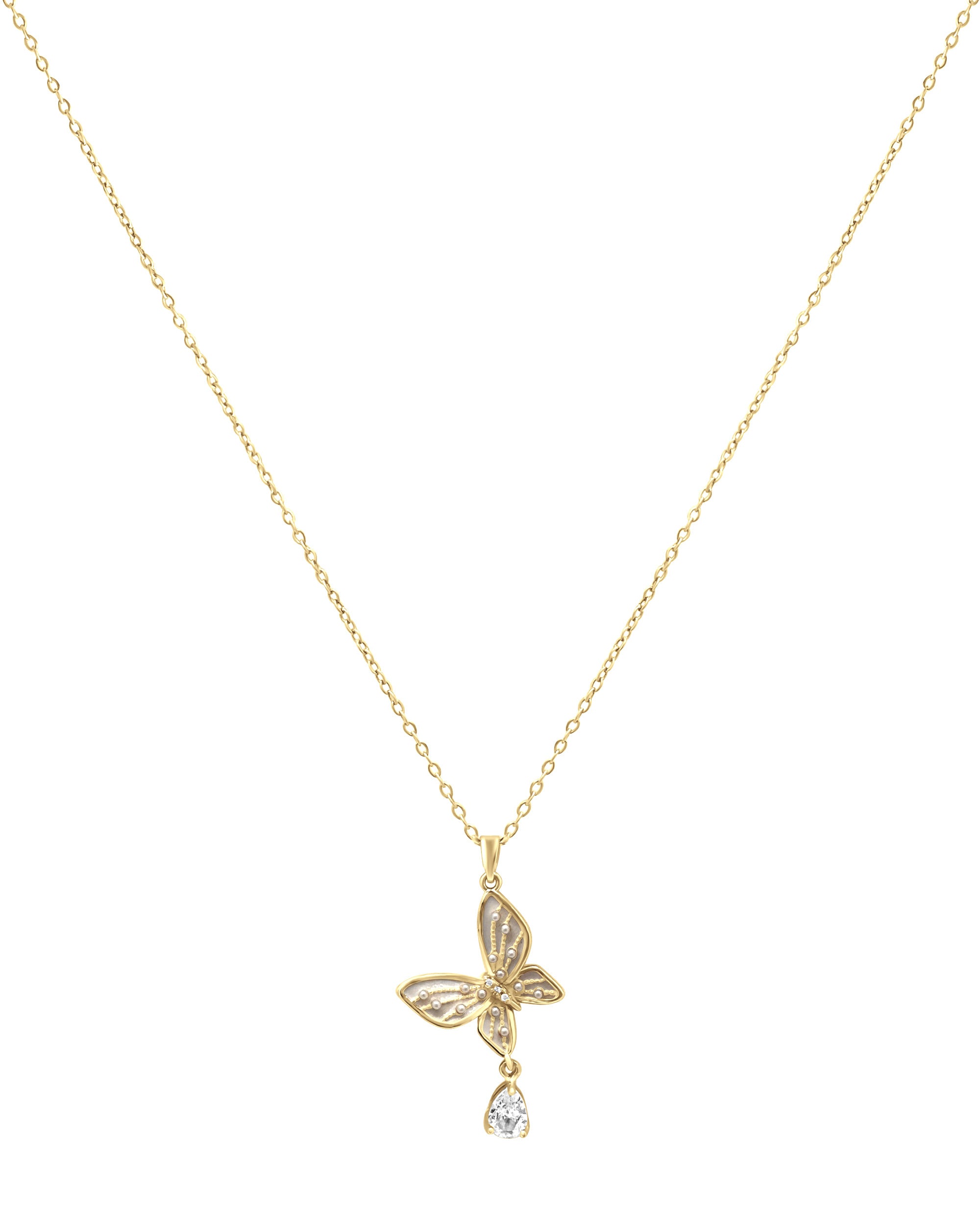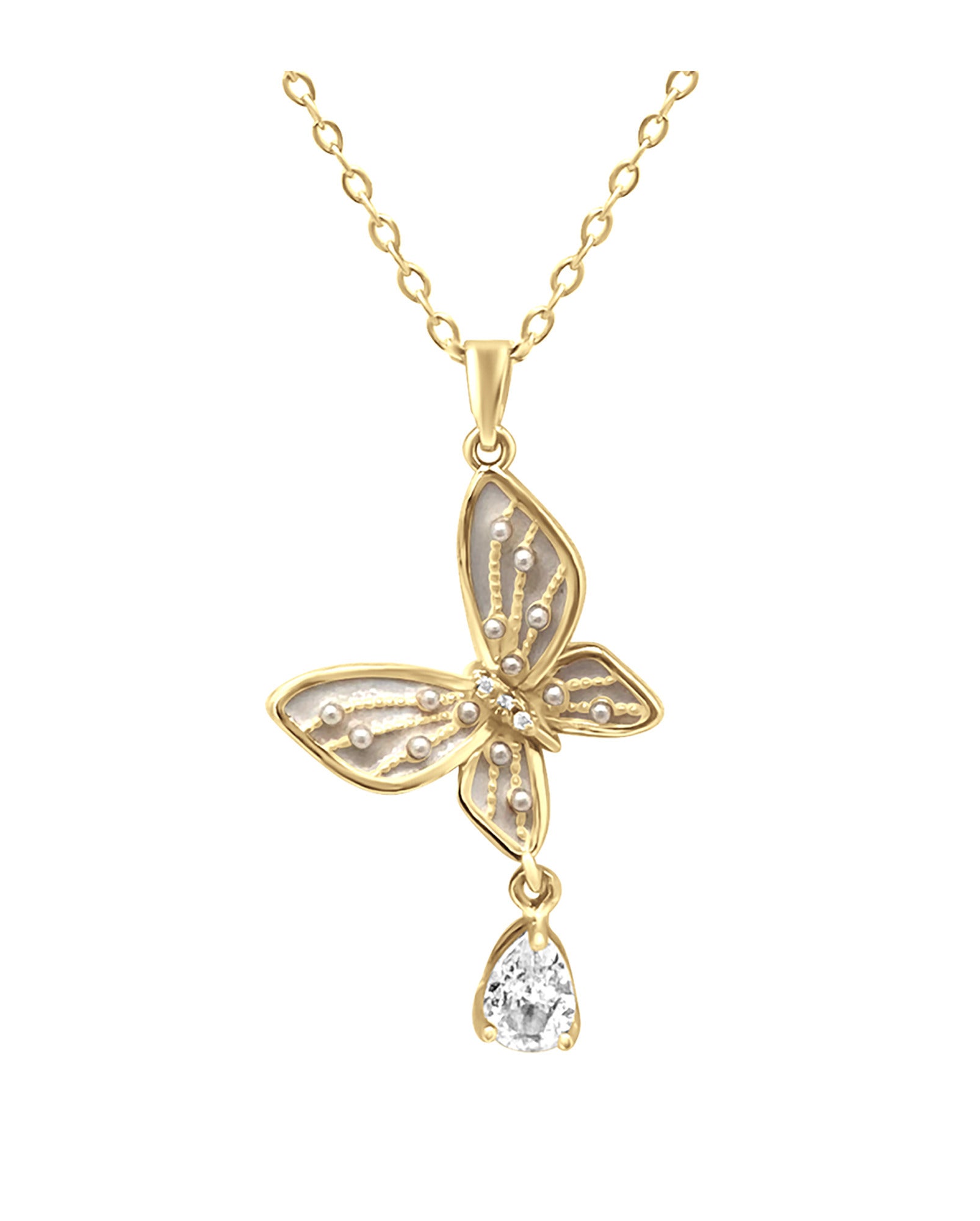 COLLIER EN ACIER DORE PAPILLON NACRE AVEC MINI PERLES ET SOLITAIRE