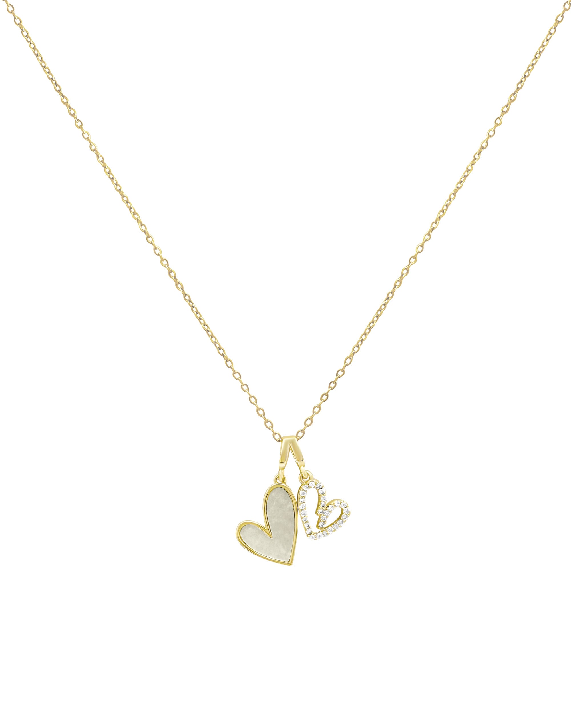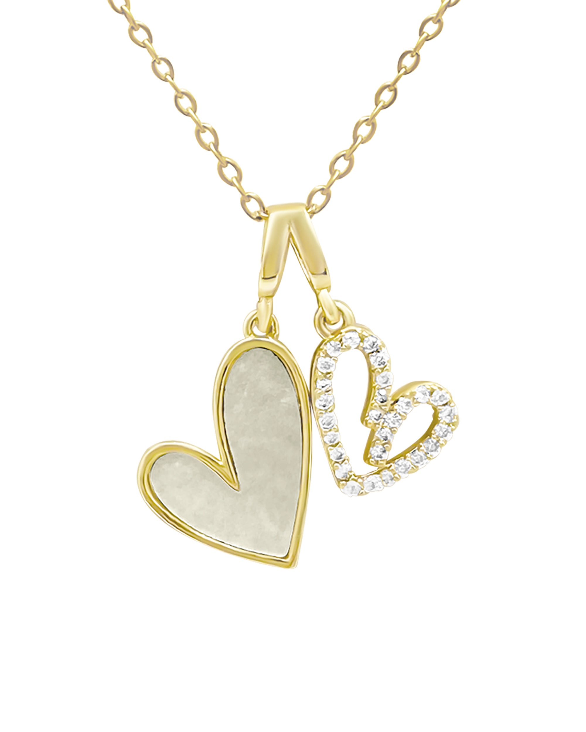 COLLIER EN ACIER DORÉ PENDENTIF DOUBLE COEUR NACRE ET ZIRCONIUM