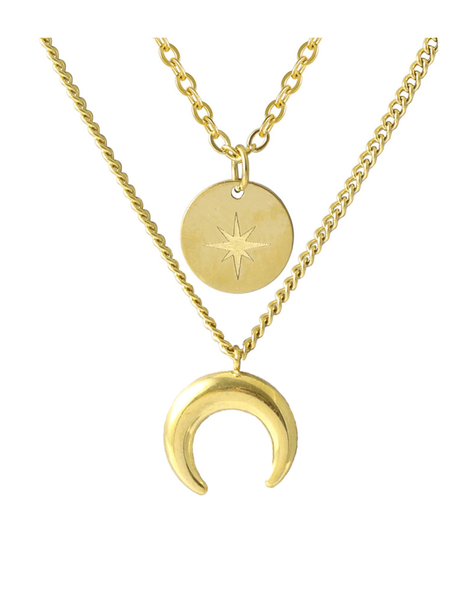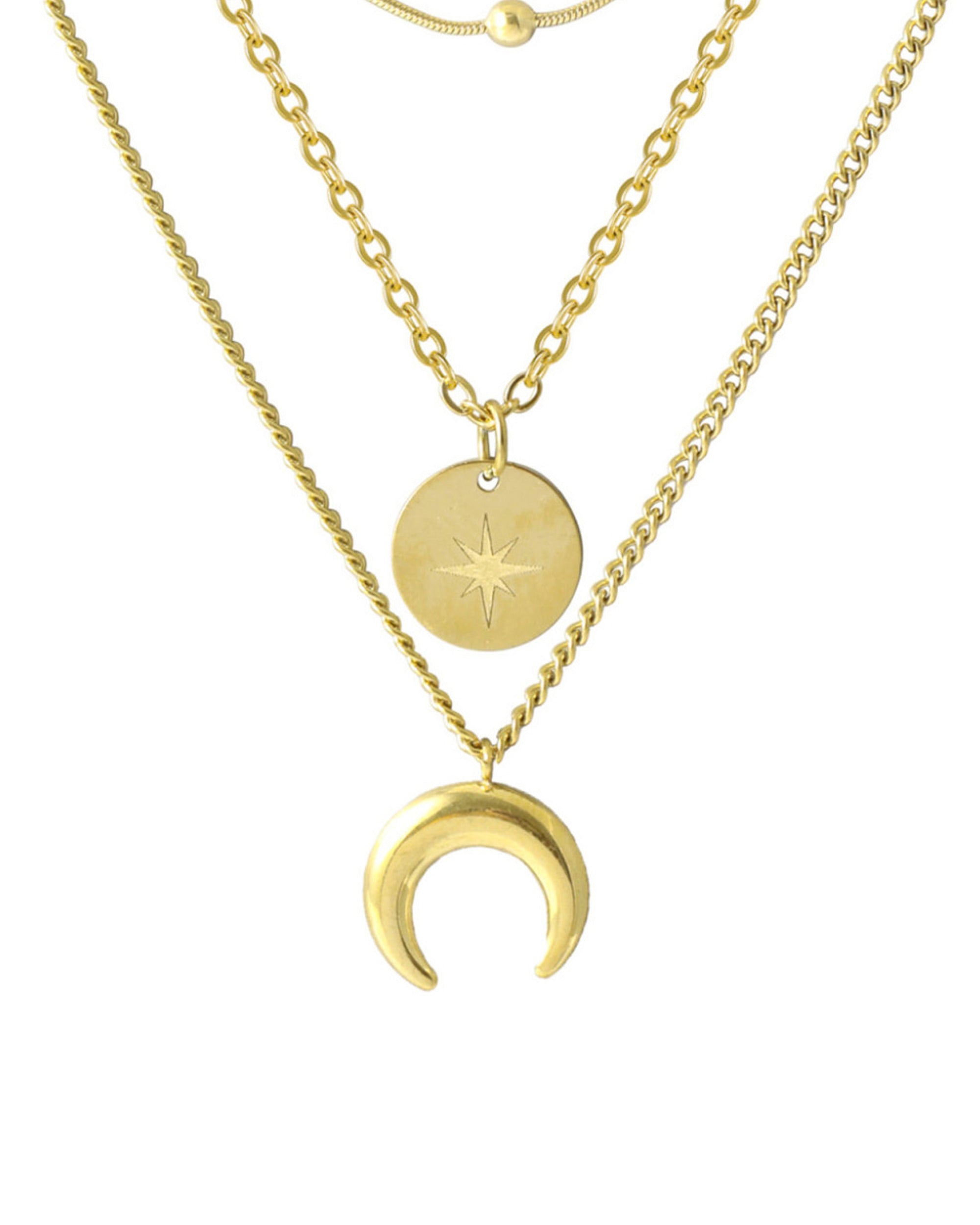 COLLIER EN ACIER DORE TRIPLE MAILLE AVEC PENDENTIF LUNE ET PASTILLE